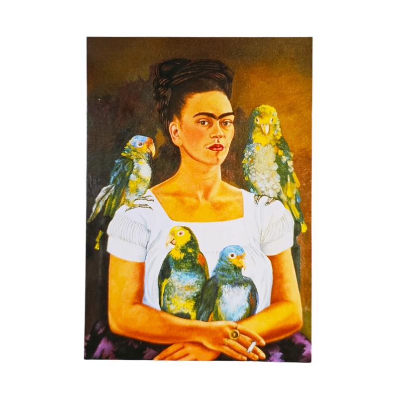 Une carte postale réunissant en une seule image les plus célèbres oeuvres de Frida Kahlo.