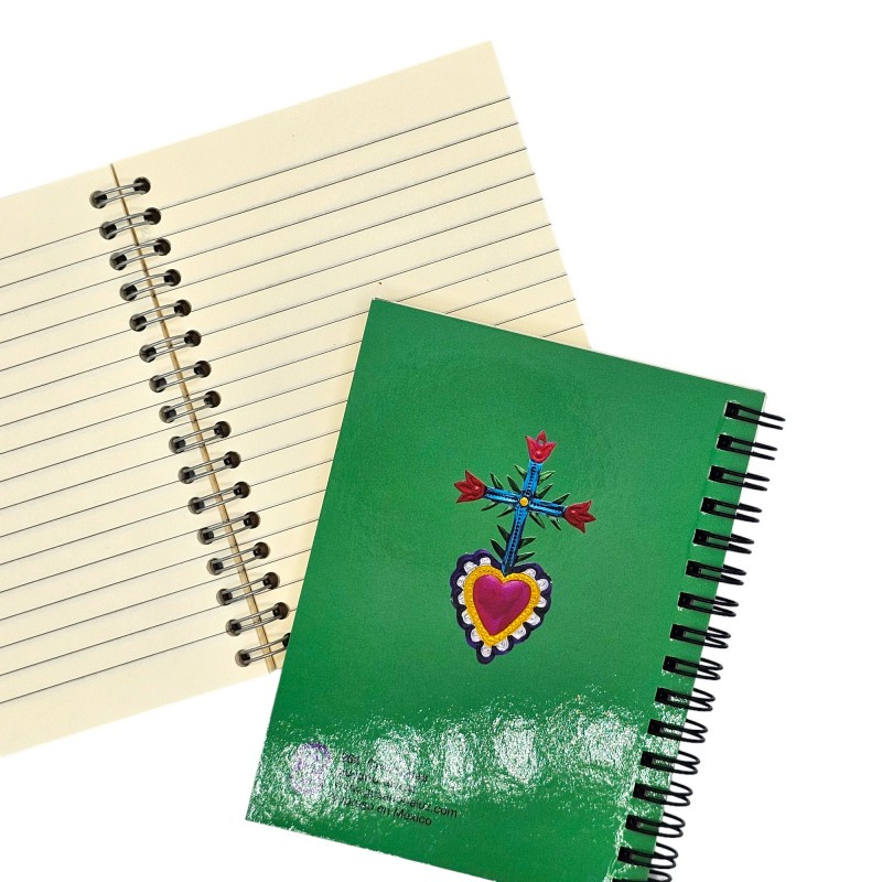 Un superbe cahier à couverture souple, avec un portrait noir et blanc de Frida Kahlo sur fond de broderies mexicaines.