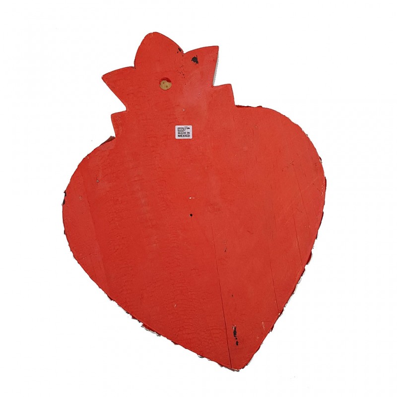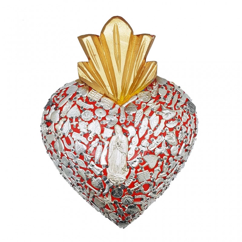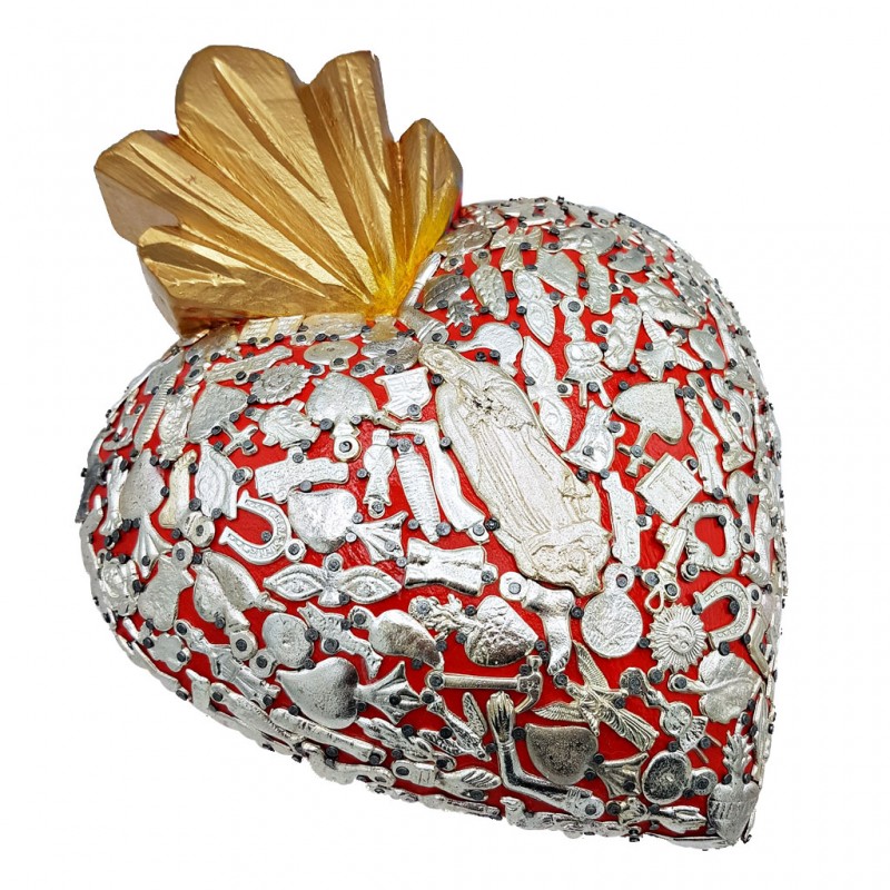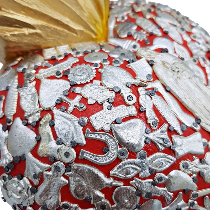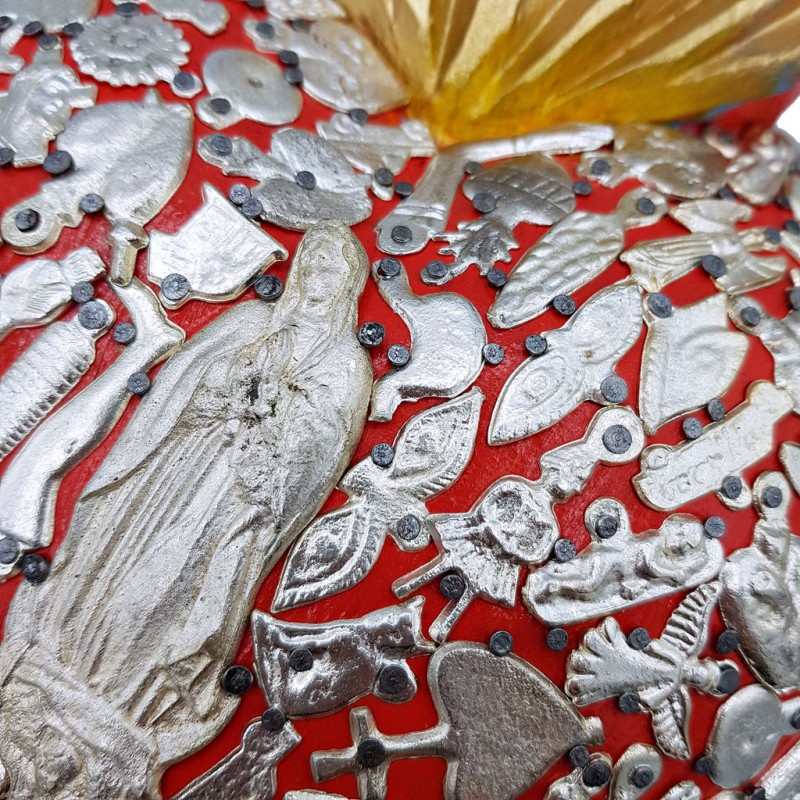 Superbe coeur sacré en bois décoré de milagros argentés. Surmonté d'une flamme recouverte de feuille d'argent.