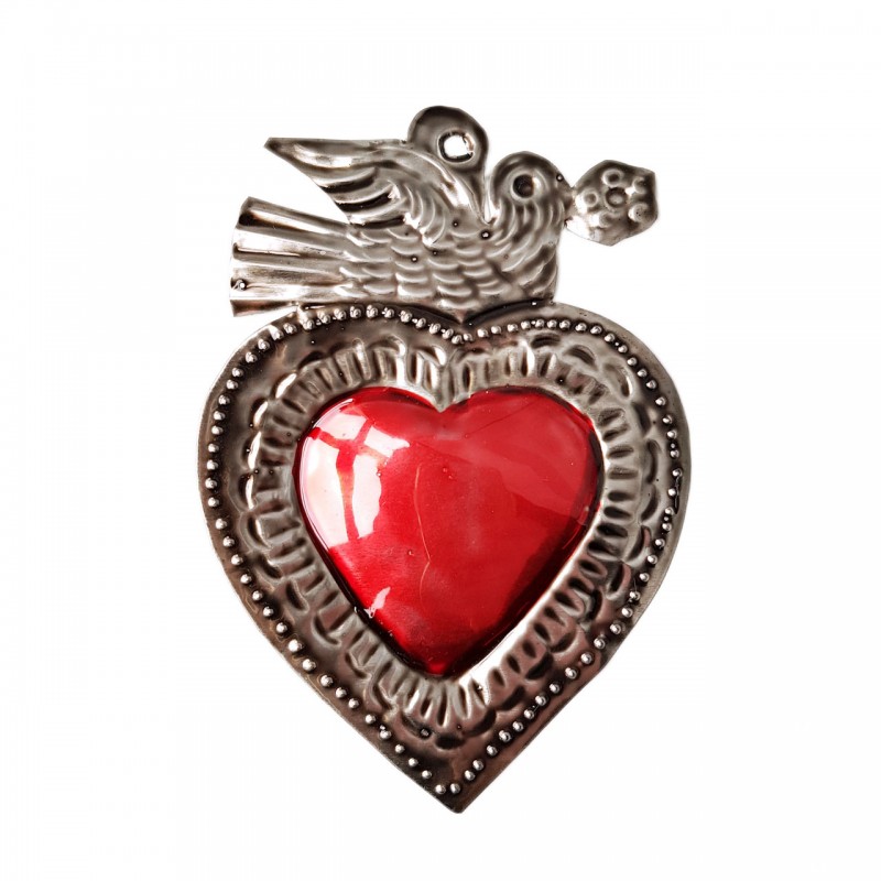 Coeur sacré mexicain décoré avec un oiseau vert.