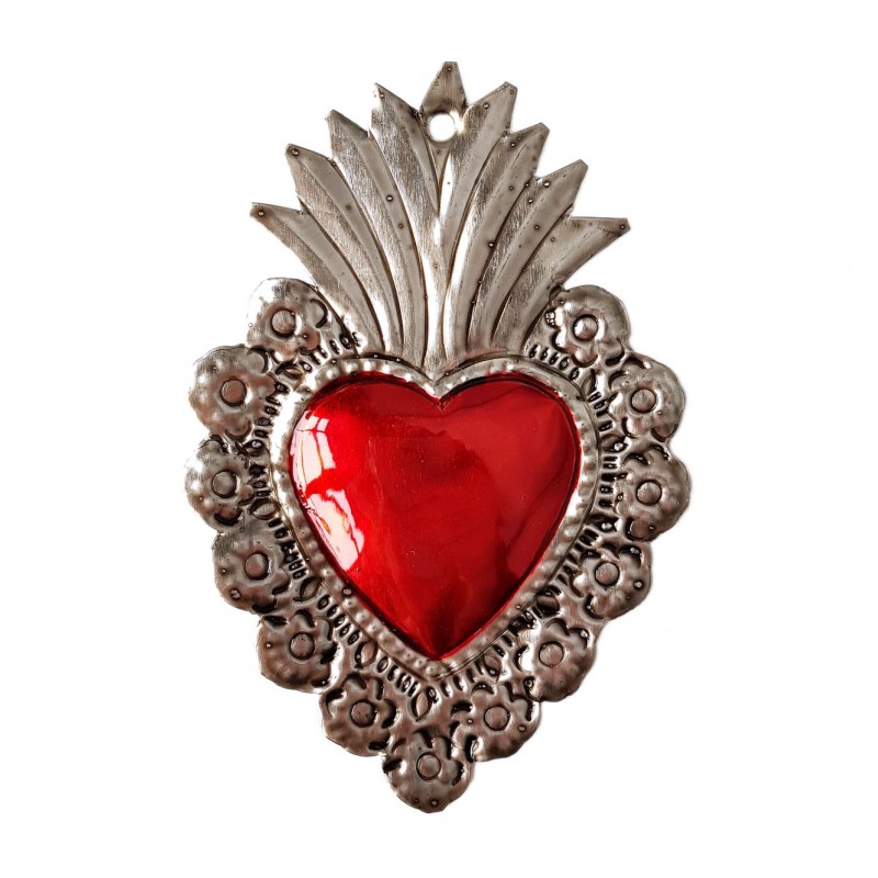 Coeur sacré mexicain à bordure fleurie et surmonté d'une flamme rouge.