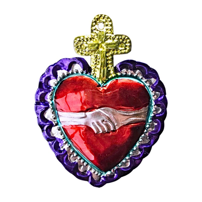 Coeur sacré avec une poignée de main et surmonté d'une croix.