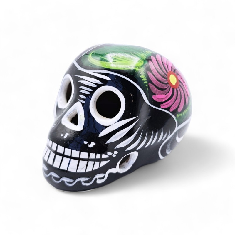 Tête de mort mexicaine bleu foncé ornée d'oiseaux, de motifs floraux colorés et de détails pailletés.