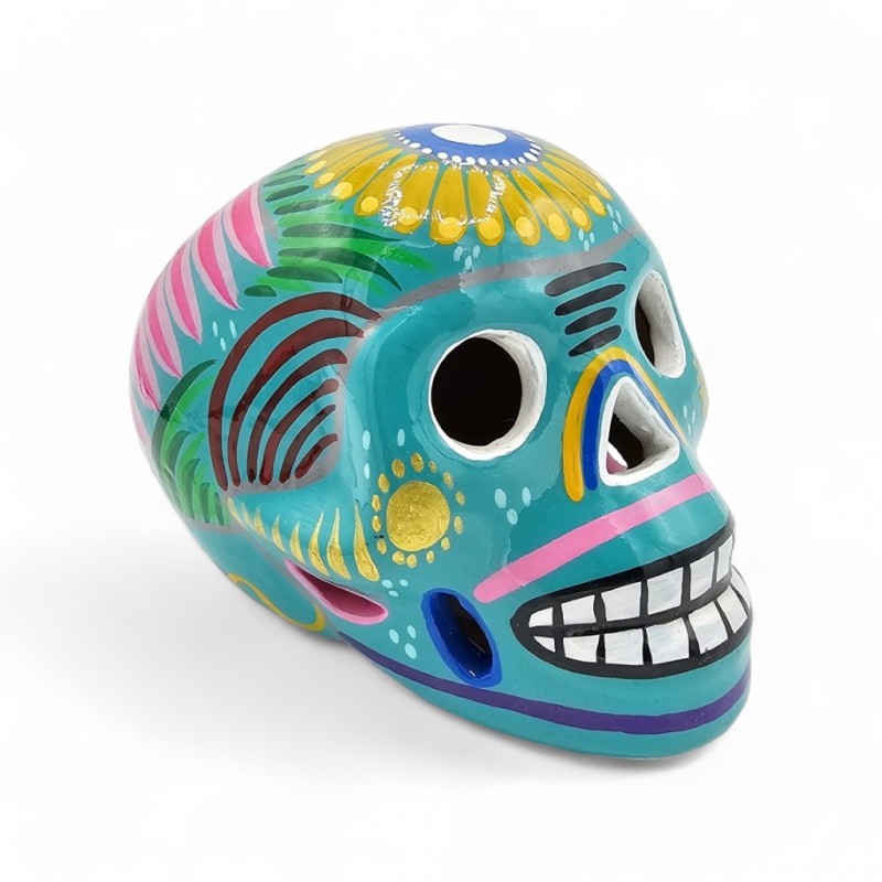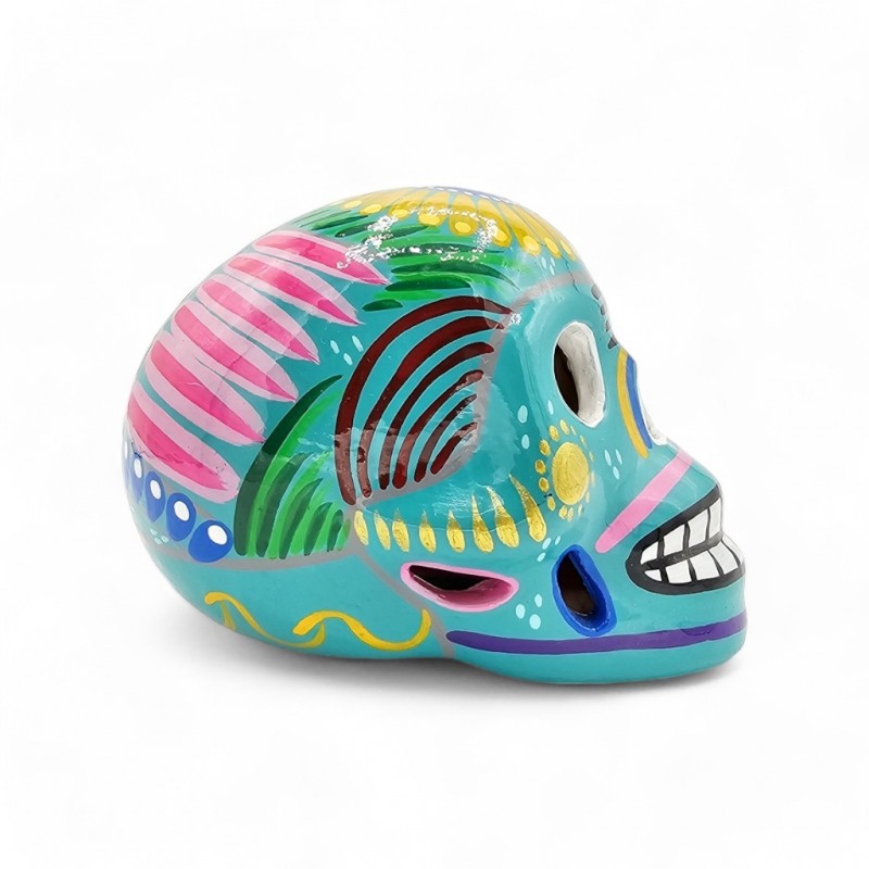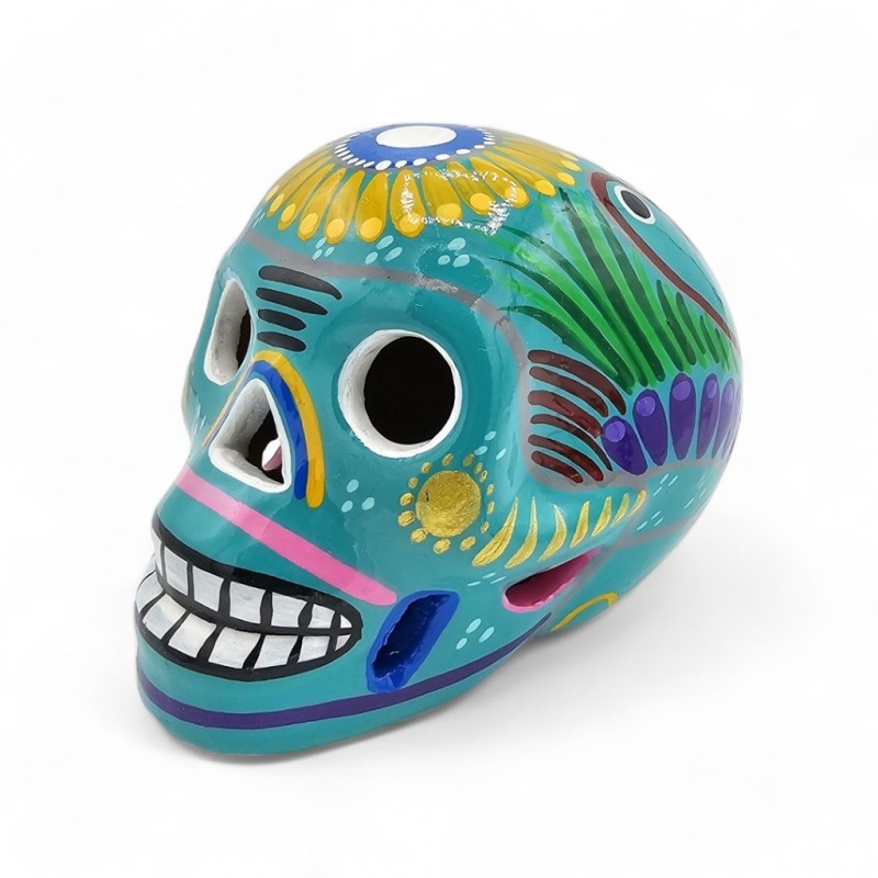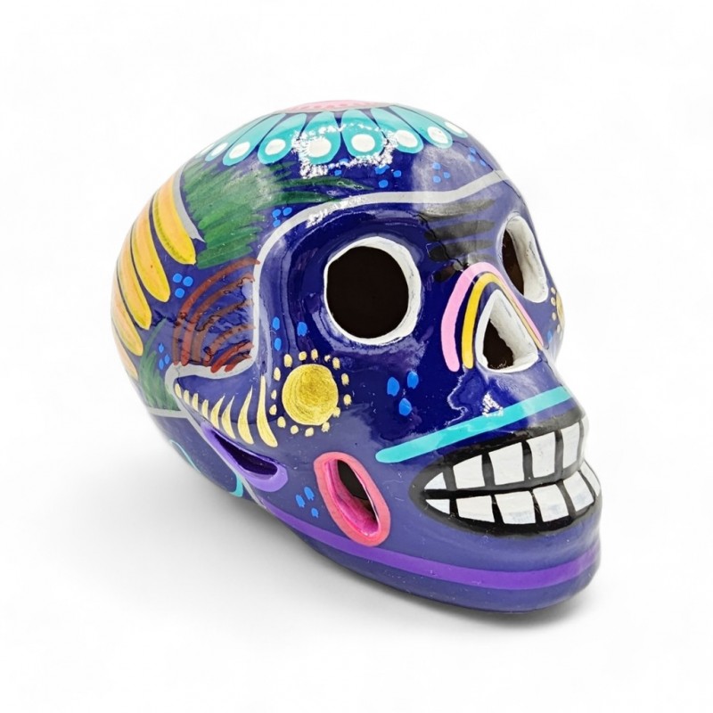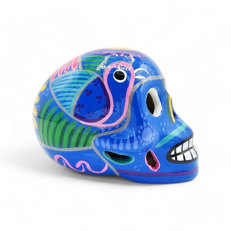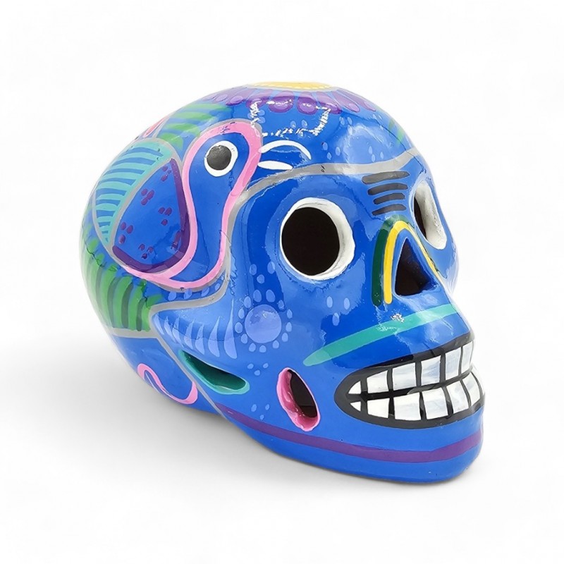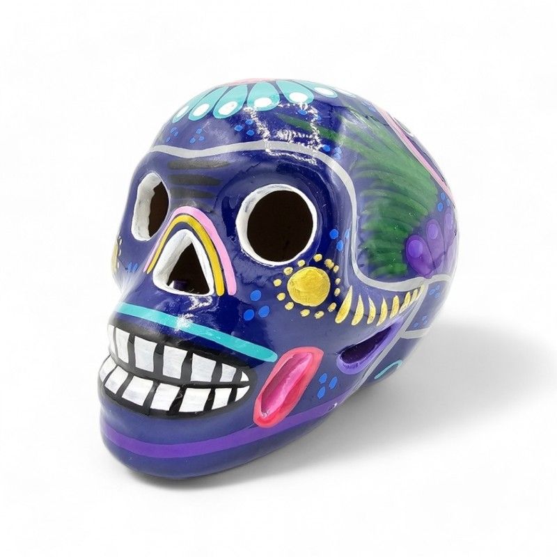 Tête de mort mexicaine bleu foncé ornée d'oiseaux, de motifs floraux colorés et de détails pailletés.