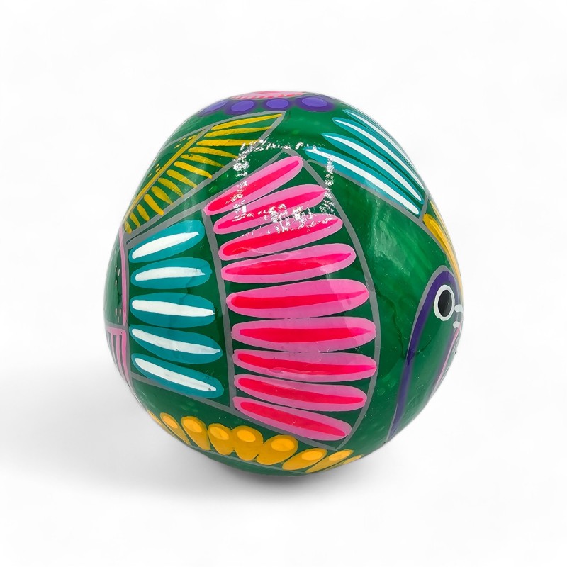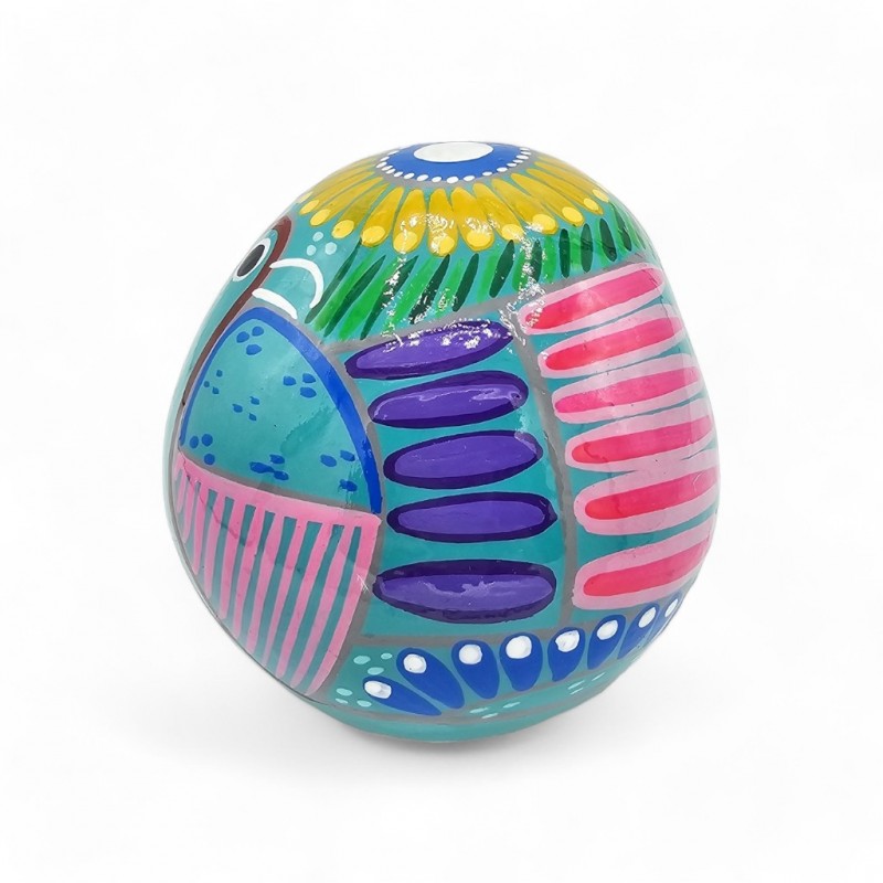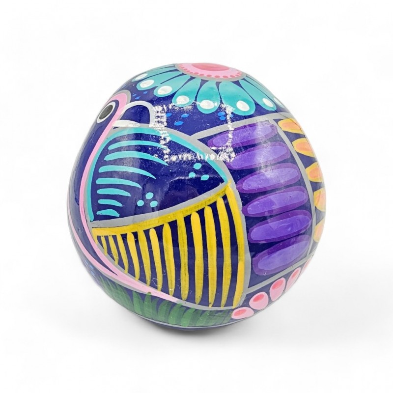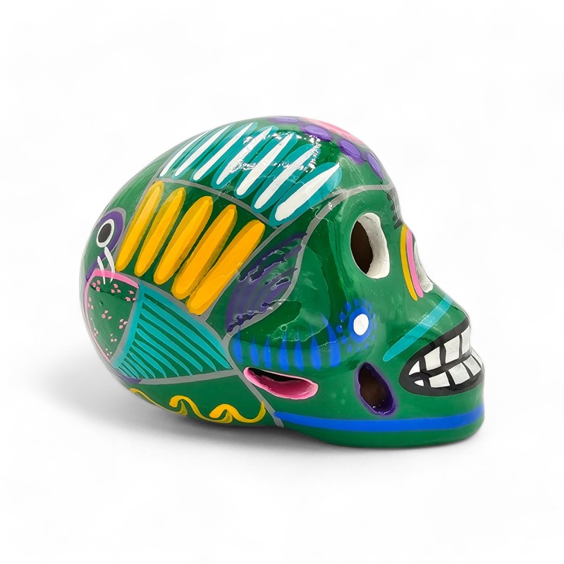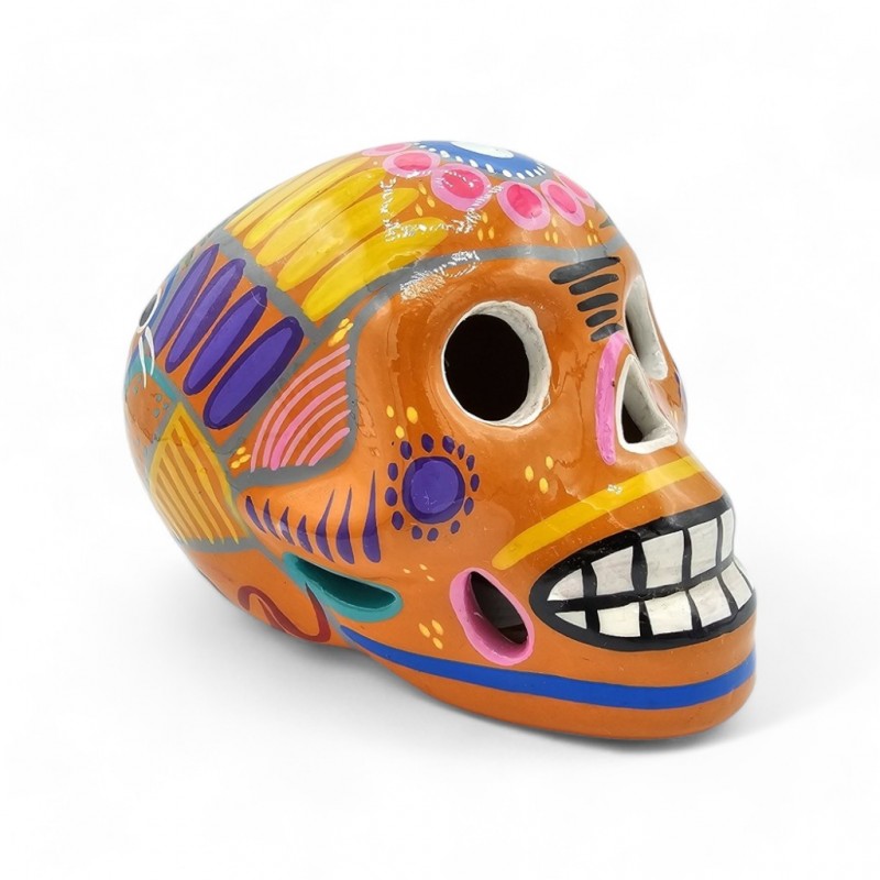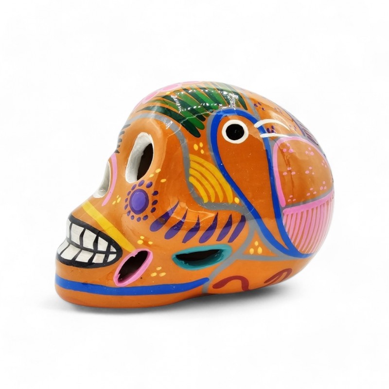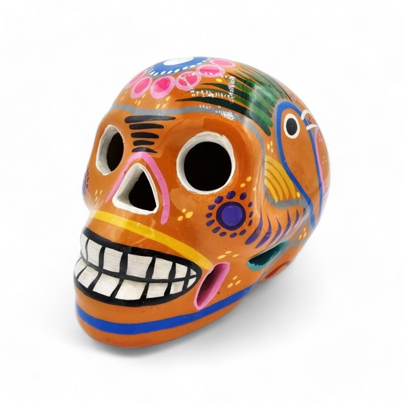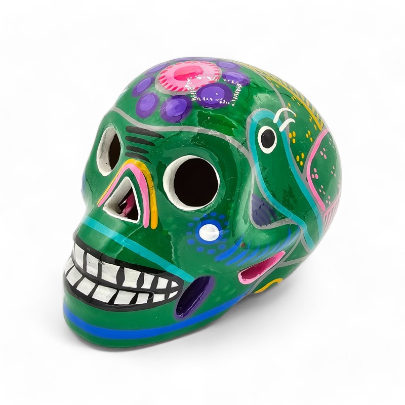 Tête de mort mexicaine bleu foncé ornée d'oiseaux, de motifs floraux colorés et de détails pailletés.