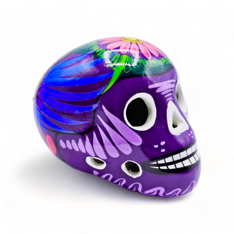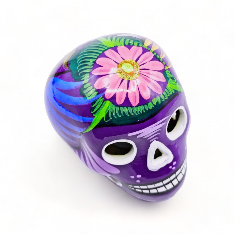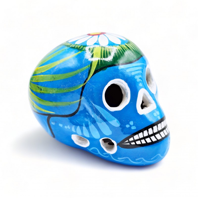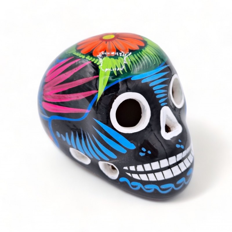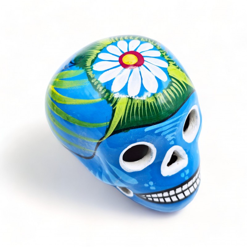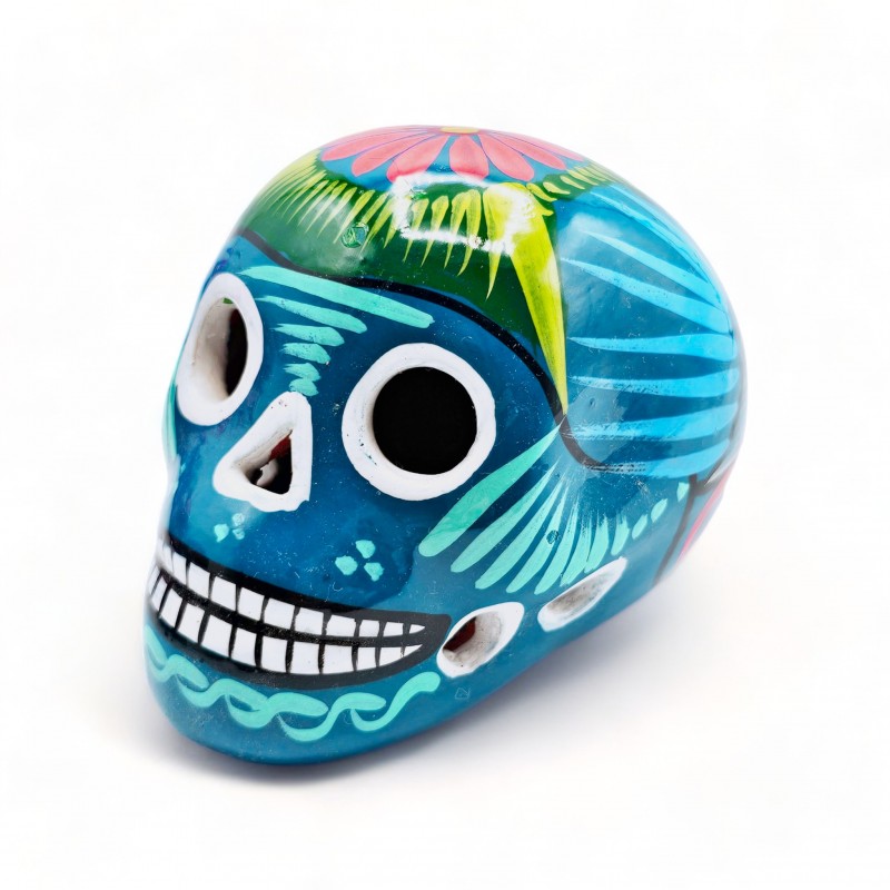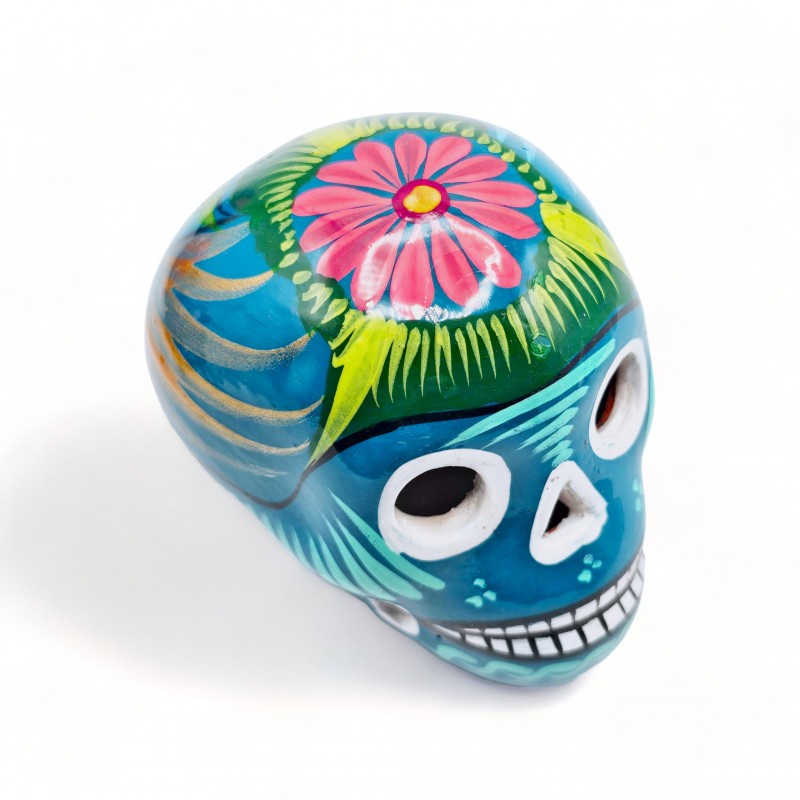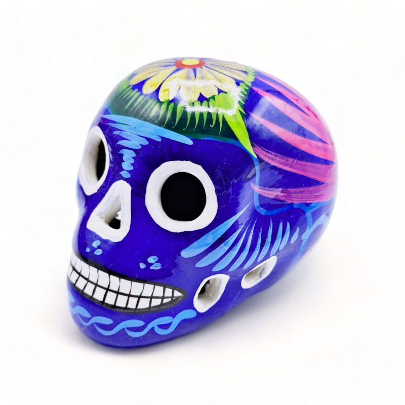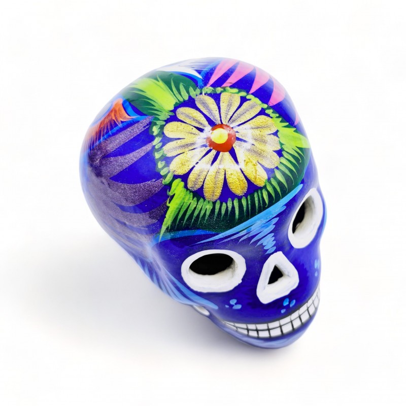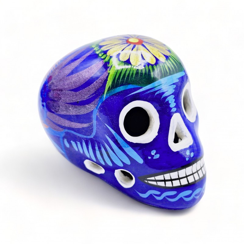 Tête de mort mexicaine bleu foncé ornée d'oiseaux, de motifs floraux colorés et de détails pailletés.