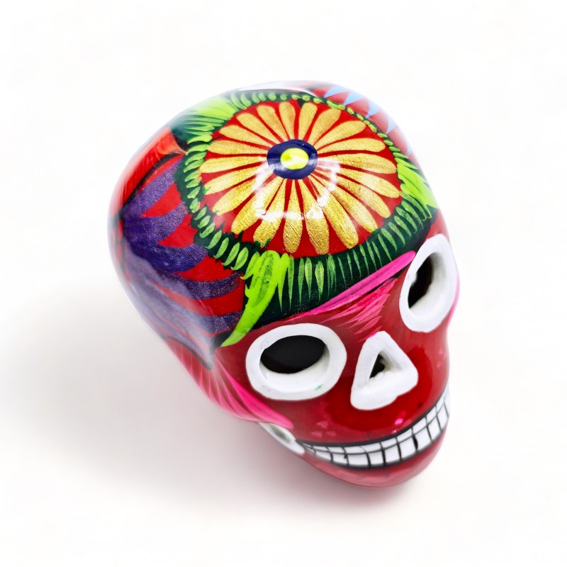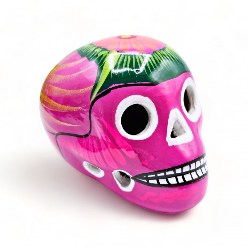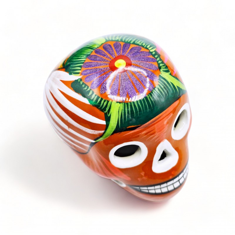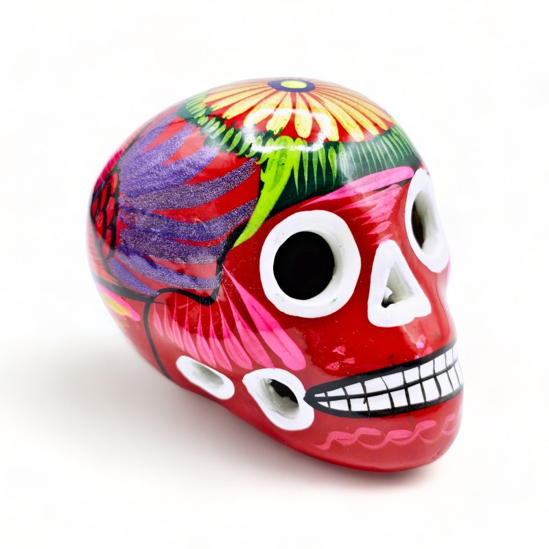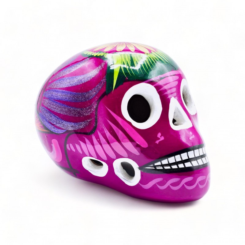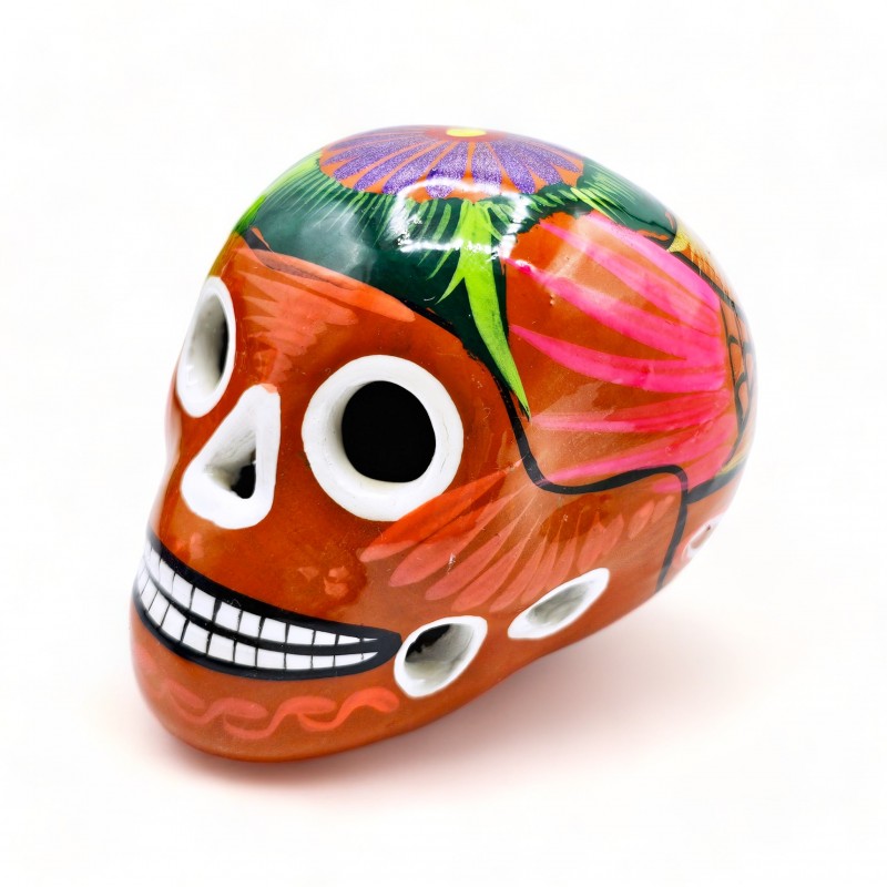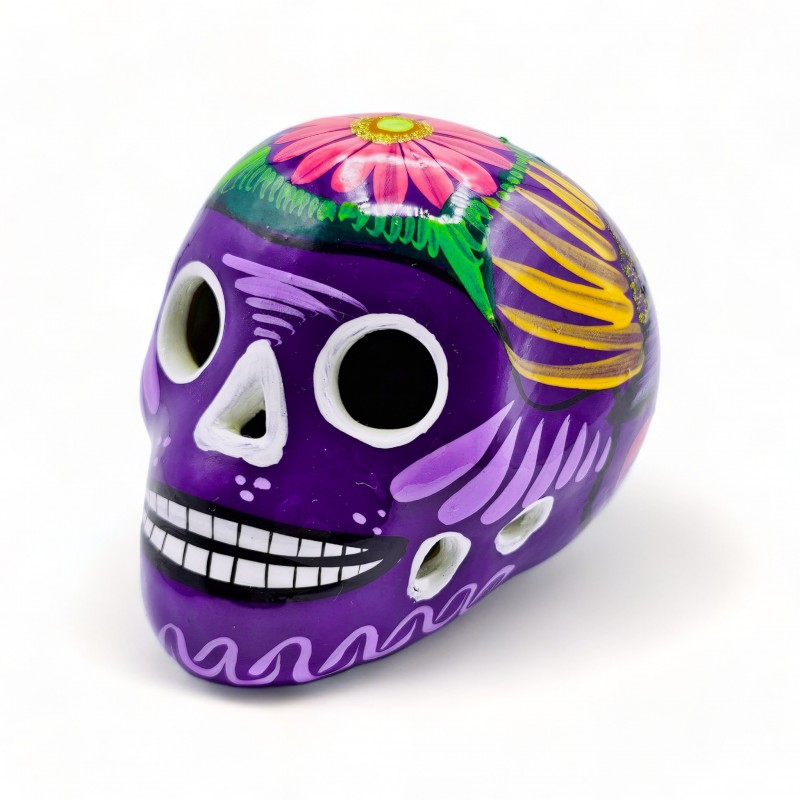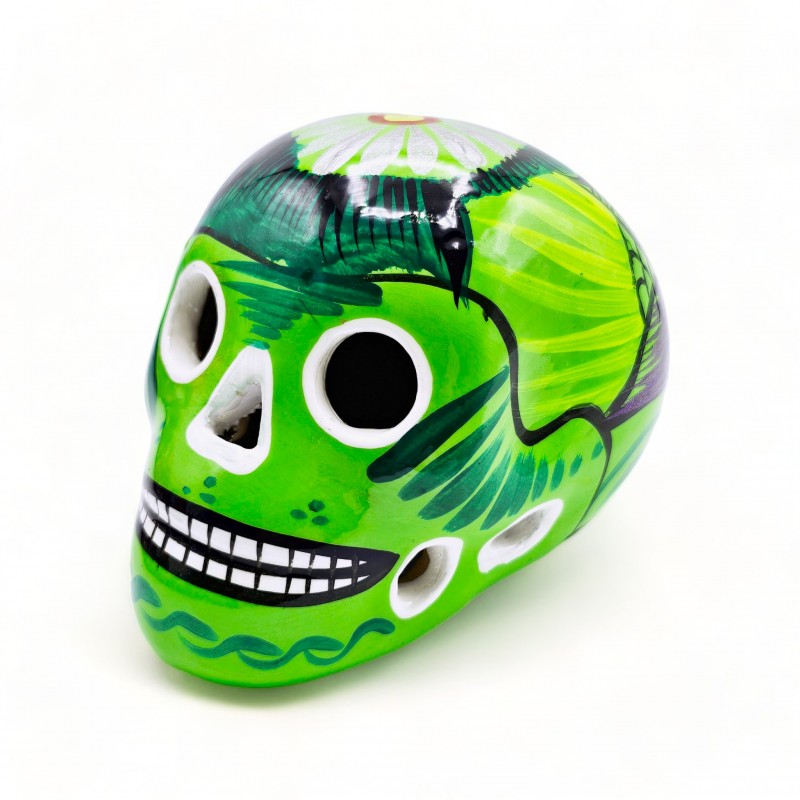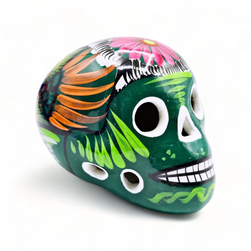 Tête de mort mexicaine bleu foncé ornée d'oiseaux, de motifs floraux colorés et de détails pailletés.
