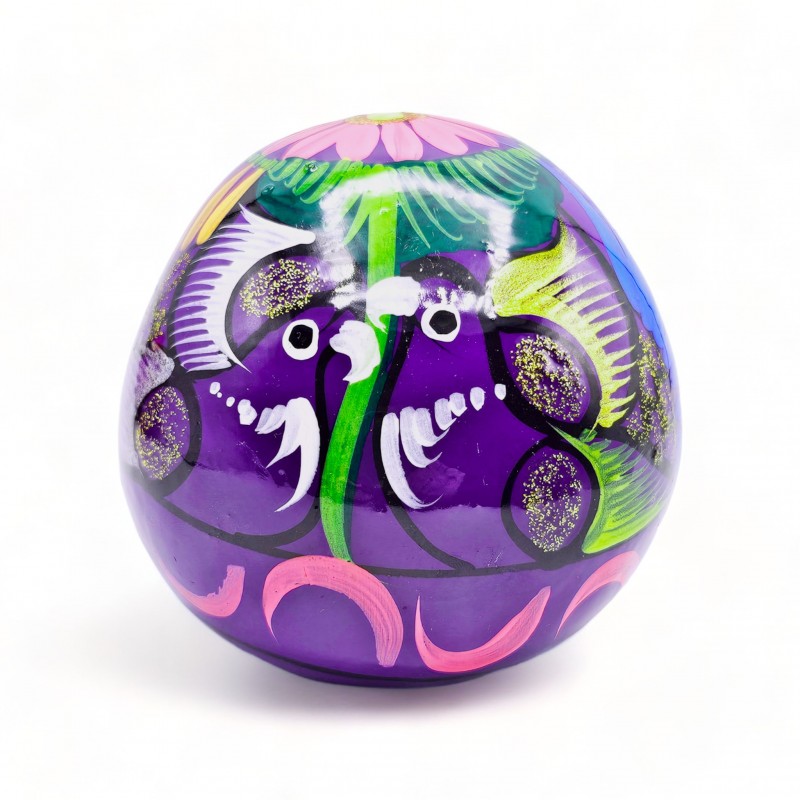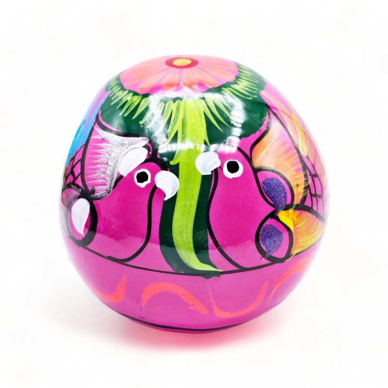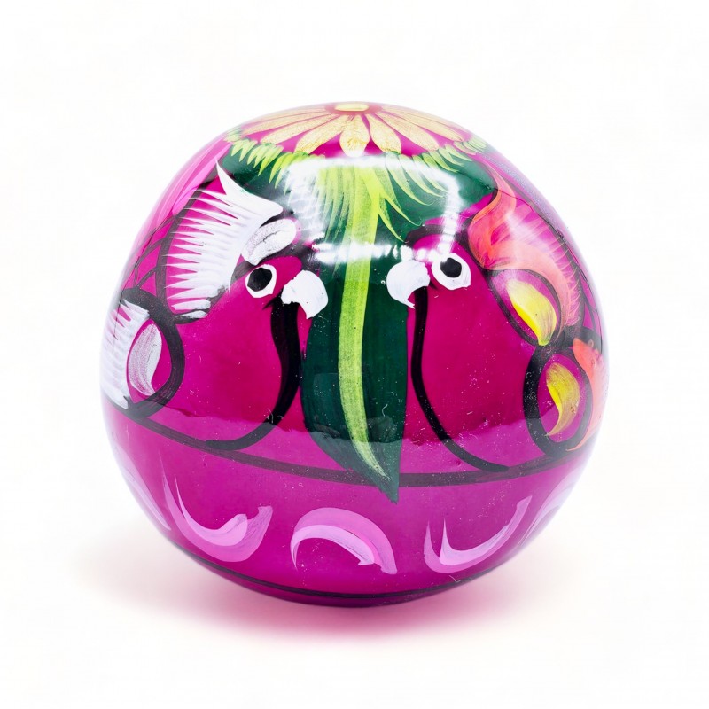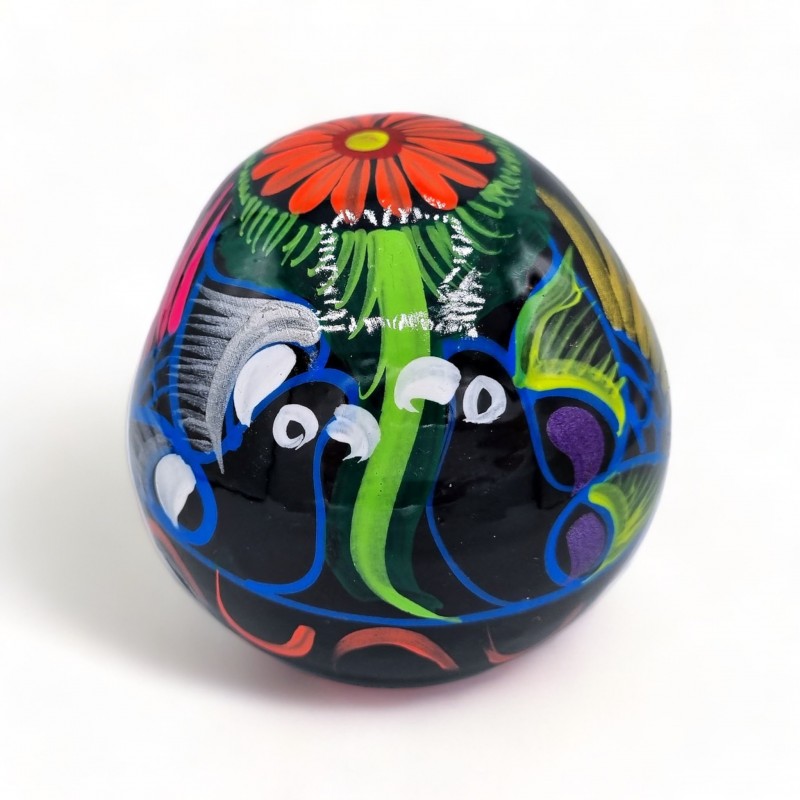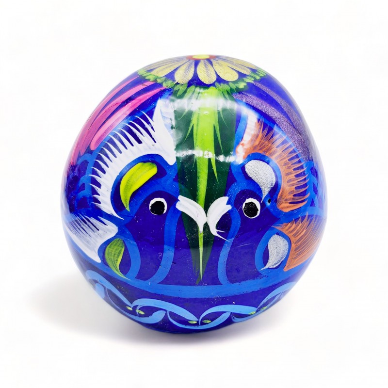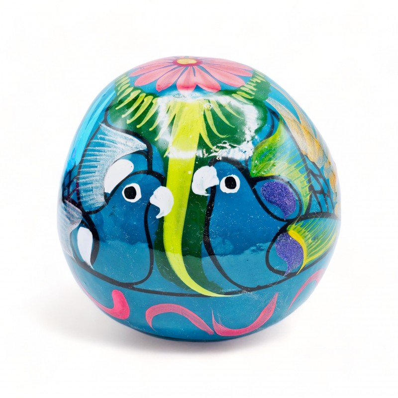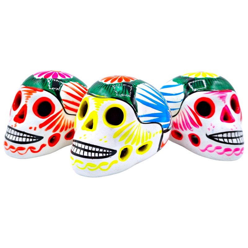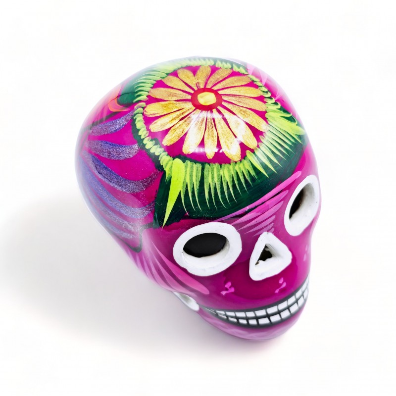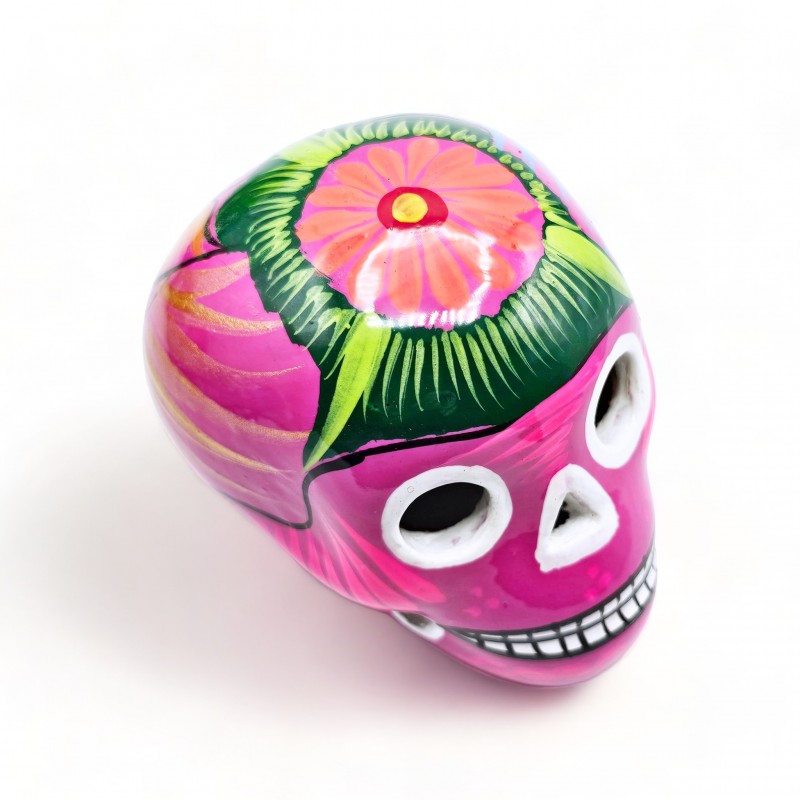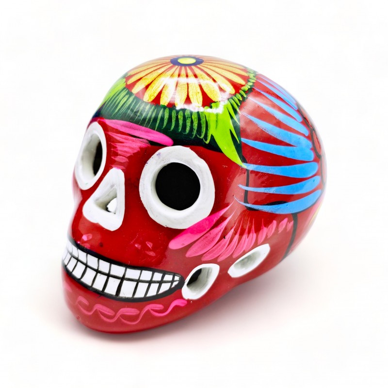 Tête de mort mexicaine bleu foncé ornée d'oiseaux, de motifs floraux colorés et de détails pailletés.