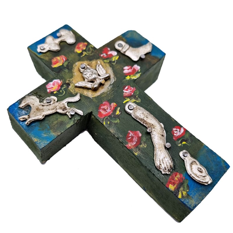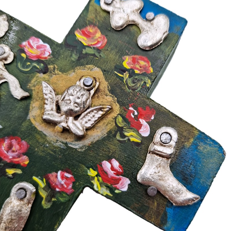 Jolie croix en bois avec une Coeur sacré au centre, peinte et décorée de milagros argentés.