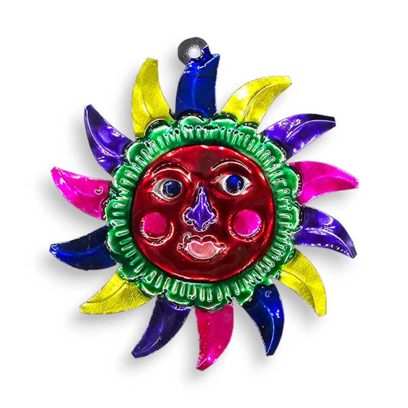 Décoration en métal en forme de soleil, peint sur les deux faces.