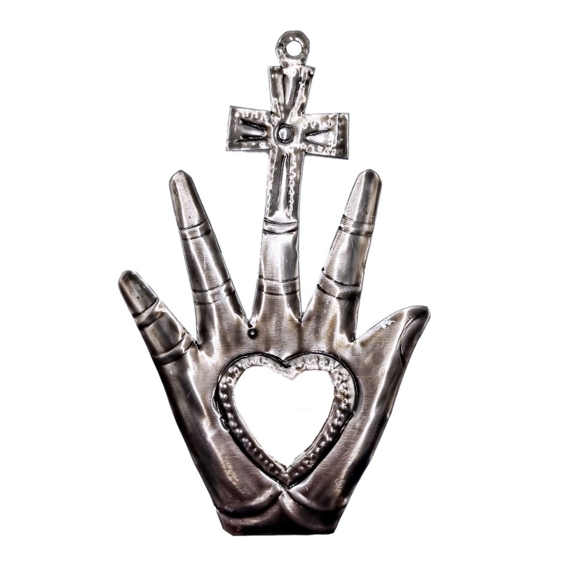 Décoration murale d'une main porte bonheur, représentée avec un coeur et une manchette à fleur.