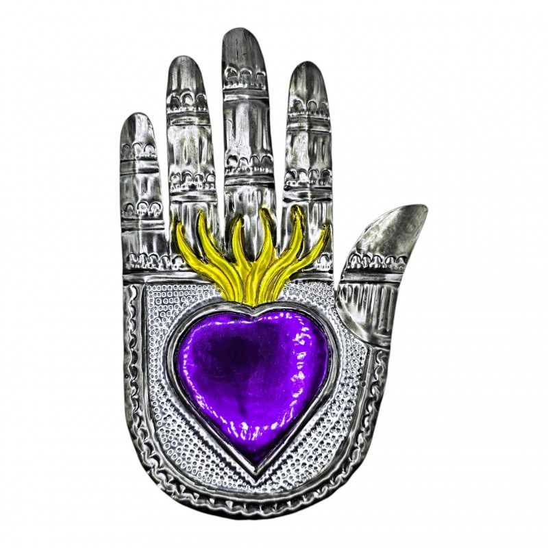 Décoration murale d'une main porte bonheur, représentée avec un coeur et une manchette à fleur.
