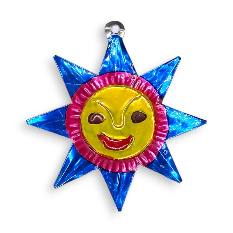 Décoration en métal en forme de soleil, peint sur les deux faces.