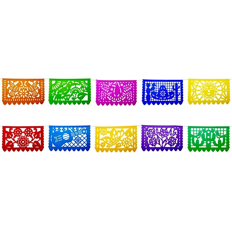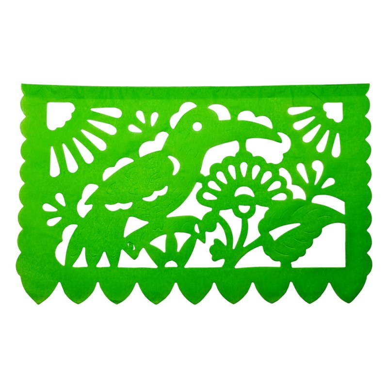 Chaque guirlande est composée de 10 fanions ajourés de motifs différents : soleil, fleurs, oiseau, papillon, ananas, palmier.