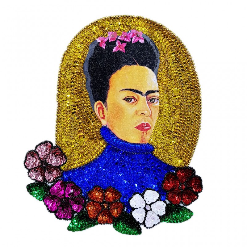 Grand appliqué en forme de coeur avec une photo de Frida Kahlo brodé de sequins roses et verts.