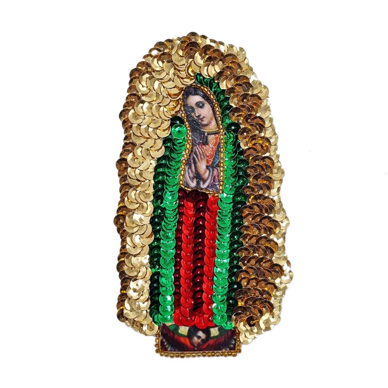 Superbe écusson ovale de la Vierge de Guadalupe, brodé de sequins et de perles dorées.