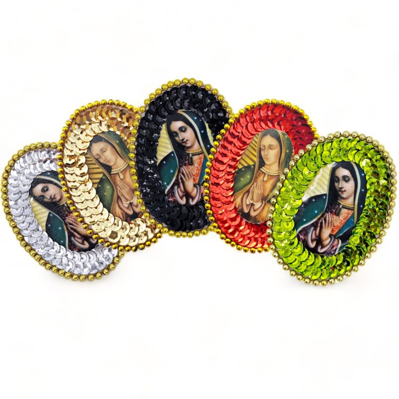 Bringen Sie Ihre Kreationen zum Leuchten mit diesem ovalen Aufnäher der Jungfrau von Guadalupe, einem Symbol für Schutz und Spiritualität. Komplett handgestickt, funkelt er dank seiner Pailletten und goldenen Perlen.