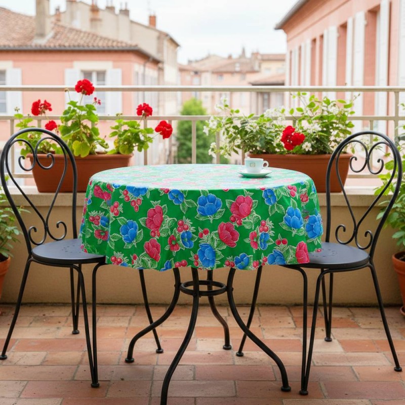 Eine fröhliche und unbeschwerte Atmosphäre kommt an Ihren Tisch mit dieser runden Wachstuchtischdecke mit lebhaftem Blumenmuster.