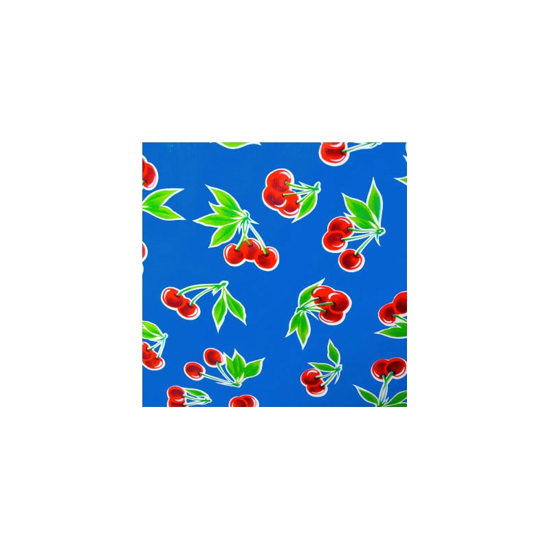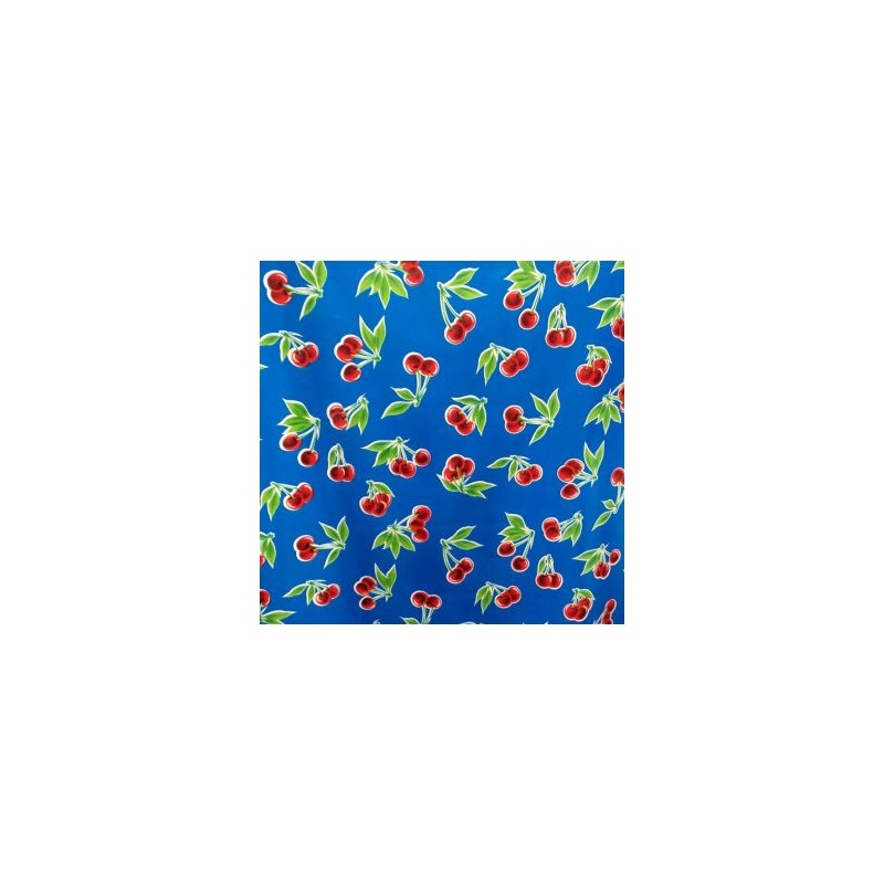 Mexikanisches Wachstuch mit Retro-Kirschmotiv auf königsblauem Grund.
