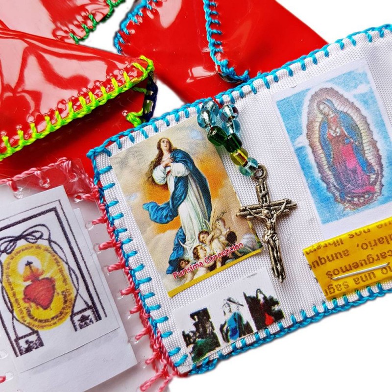 This little treasure comes in the form of a discreet miniature coin purse, closed by a practical snap button. When unfolded, you discover with a childlike wonder the most popular religious images of Mexico: the Sacred Heart of Jesus, the Virgin of Guadalupe, the Holy Family, and the Child Jesus, as well as venerated local saints like San Charbel or the Virgen de Juquila.