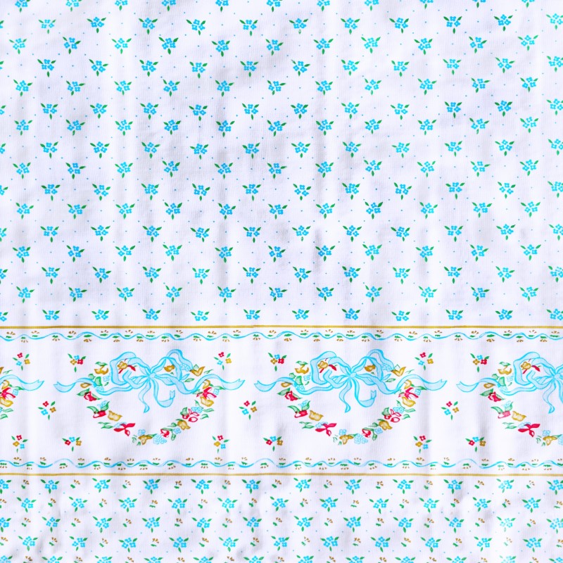 Flowery Mexican oilcloth with ribbons on the borders, in a retro style.