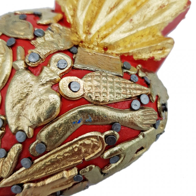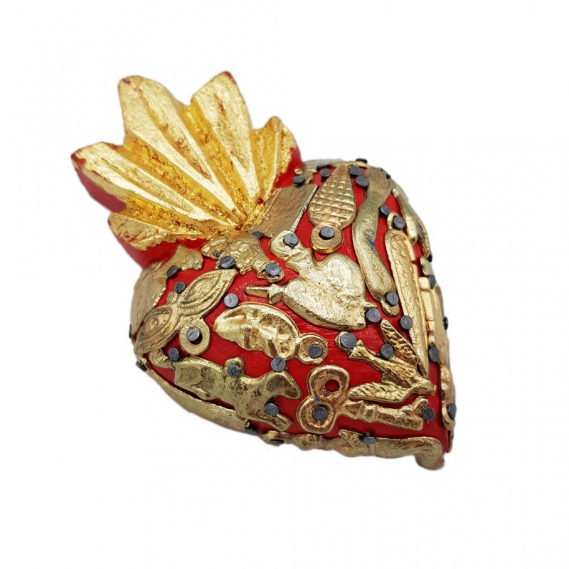 Hermoso sagrado corazón de madera decorado con milagros dorados. Rematado por una llama cubierta con hoja de oro.