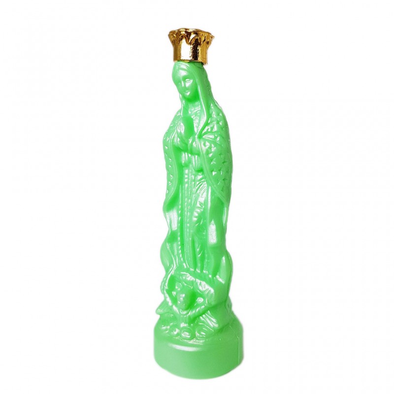 Botella pequeña para agua bendita en forma de Virgen de Guadalupe verde iridiscente.