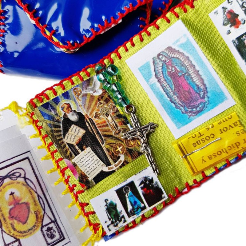 Este pequeño tesoro se presenta en forma de un discreto monedero miniatura, cerrado con un práctico botón de presión. Al desplegarlo, se descubre con asombro infantil las imágenes piadosas más populares de México: el Sagrado Corazón de Jesús, la Virgen de Guadalupe, la Sagrada Familia y el Niño Jesús, además de santos locales venerados como San Charbel o la Virgen de Juquila.
