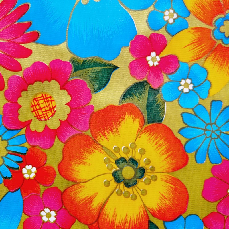 ¡Déjate seducir por la exuberancia del estampado Jamaica! Con su multitud de flores pop inspiradas en los años 60 que florecen sobre un fondo dorado, este hule aporta un toque flower power, vibrante y resueltamente alegre a tus proyectos. Una verdadera explosión de colores para alegrar tu interior o tu jardín.