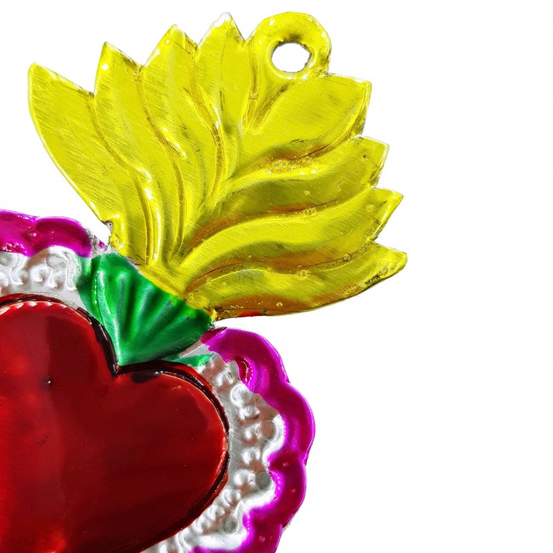 Petit coeur sacré mexicain surmonté d'une flamme jaune.