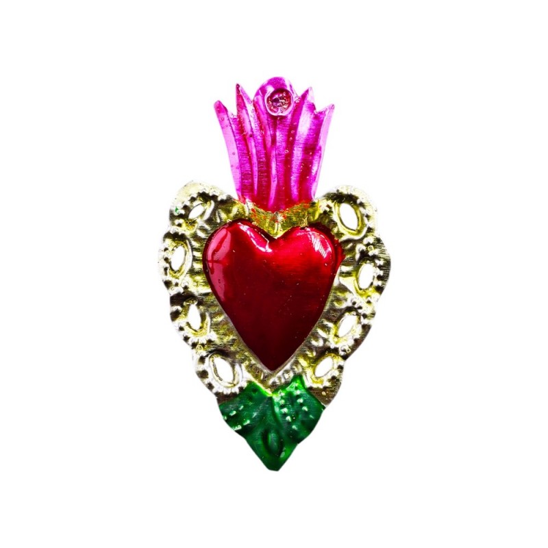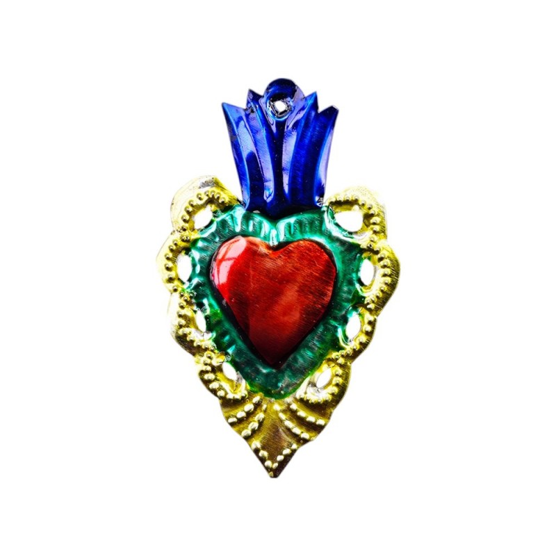 Objet typique de l'artisanat populaire mexicain, le Cœur Sacré (ou ex-voto) est à l'origine offert dans les églises à un saint en demande ou en remerciement d'un vœu exaucé. Véritable porte-bonheur, il incarne toute la ferveur et la tradition du Mexique.