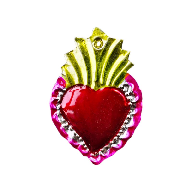 Objet typique de l'artisanat populaire mexicain, le Cœur Sacré (ou ex-voto) est à l'origine offert dans les églises à un saint en demande ou en remerciement d'un vœu exaucé. Véritable porte-bonheur, il incarne toute la ferveur et la tradition du Mexique.
