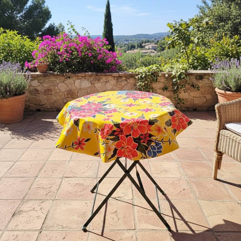 Le soleil des îles s'invite à votre table avec cette nappe ronde en toile cirée au motif floral vibrant.