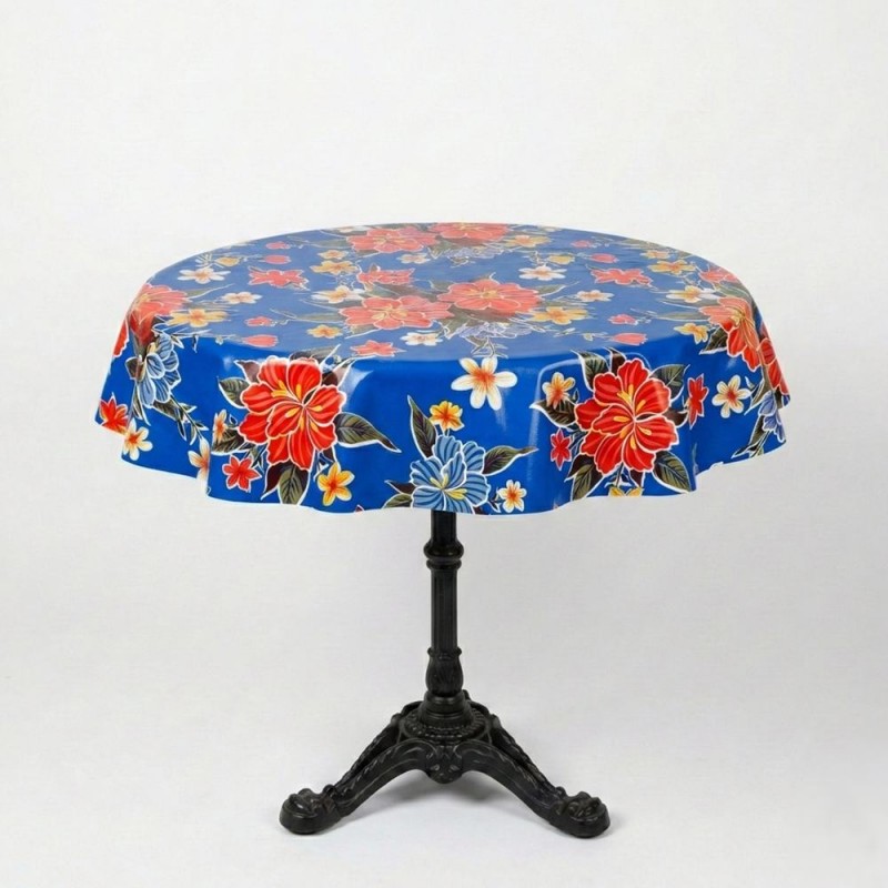 Le soleil des îles s'invite à votre table avec cette nappe ronde en toile cirée au motif floral vibrant.