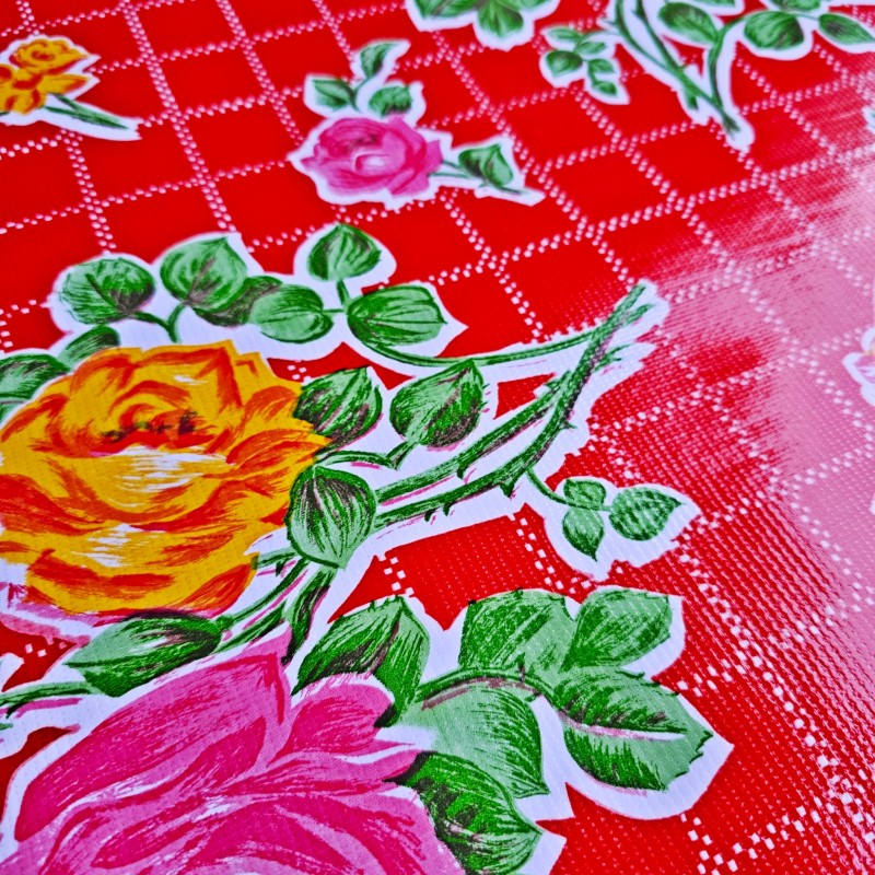 Toile cirée mexicaine avec des fleurs sur fond rouge à carreaux, dans un style vintage.