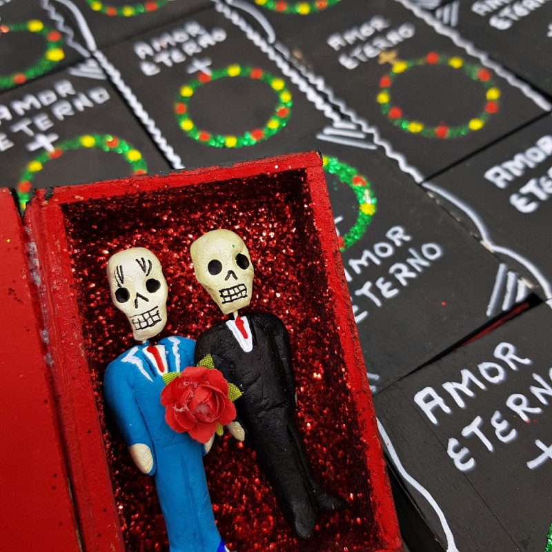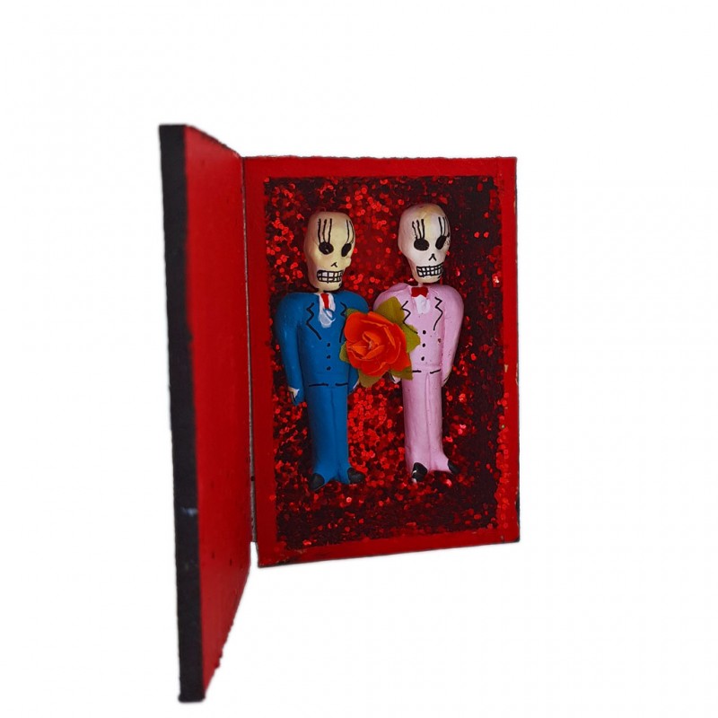 Petite boîte en forme de cercueil portant l'inscription Amor Eterno, Amour éternel. Une fois ouvert on y découvre un couple de squelettes mariés.