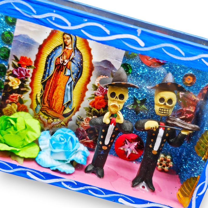 Grande boîte vitrée mettant en scène un autel d'offrandes dédié à la Vierge de Guadalupe.