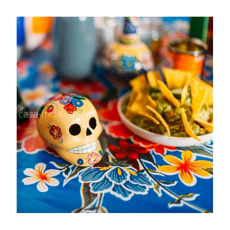 Een waar eerbetoon aan de Mexicaanse flora, het blauwe Hibisco tafelzeil verlicht onmiddellijk uw interieur! De grote rode en gele bloemen bloeien op een koningsblauwe achtergrond om een warme en exotische sfeer te creëren. Geen eentonige tafels meer: deze flamboyante print is de ideale keuze voor een feestelijke en vrolijke decoratie.